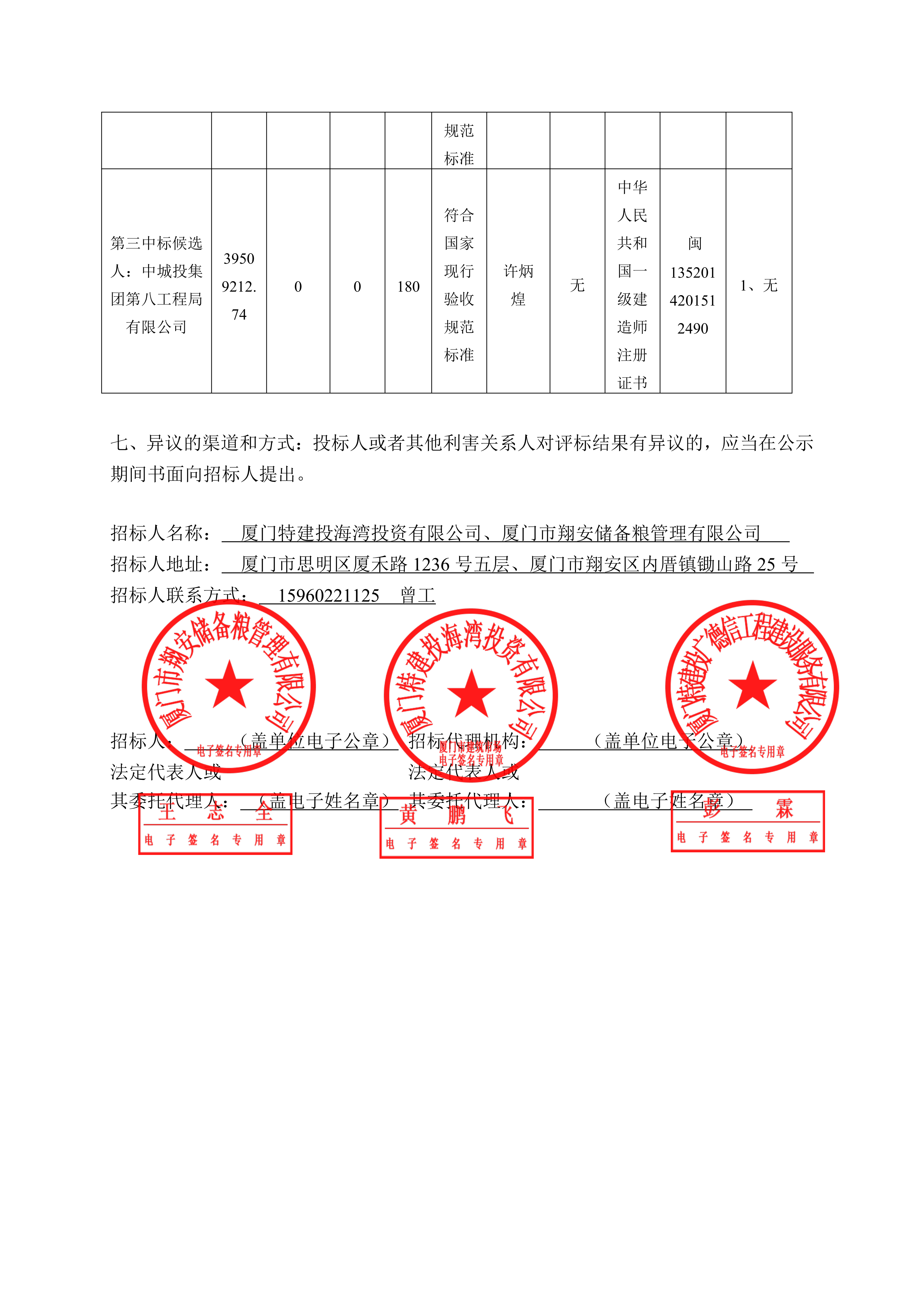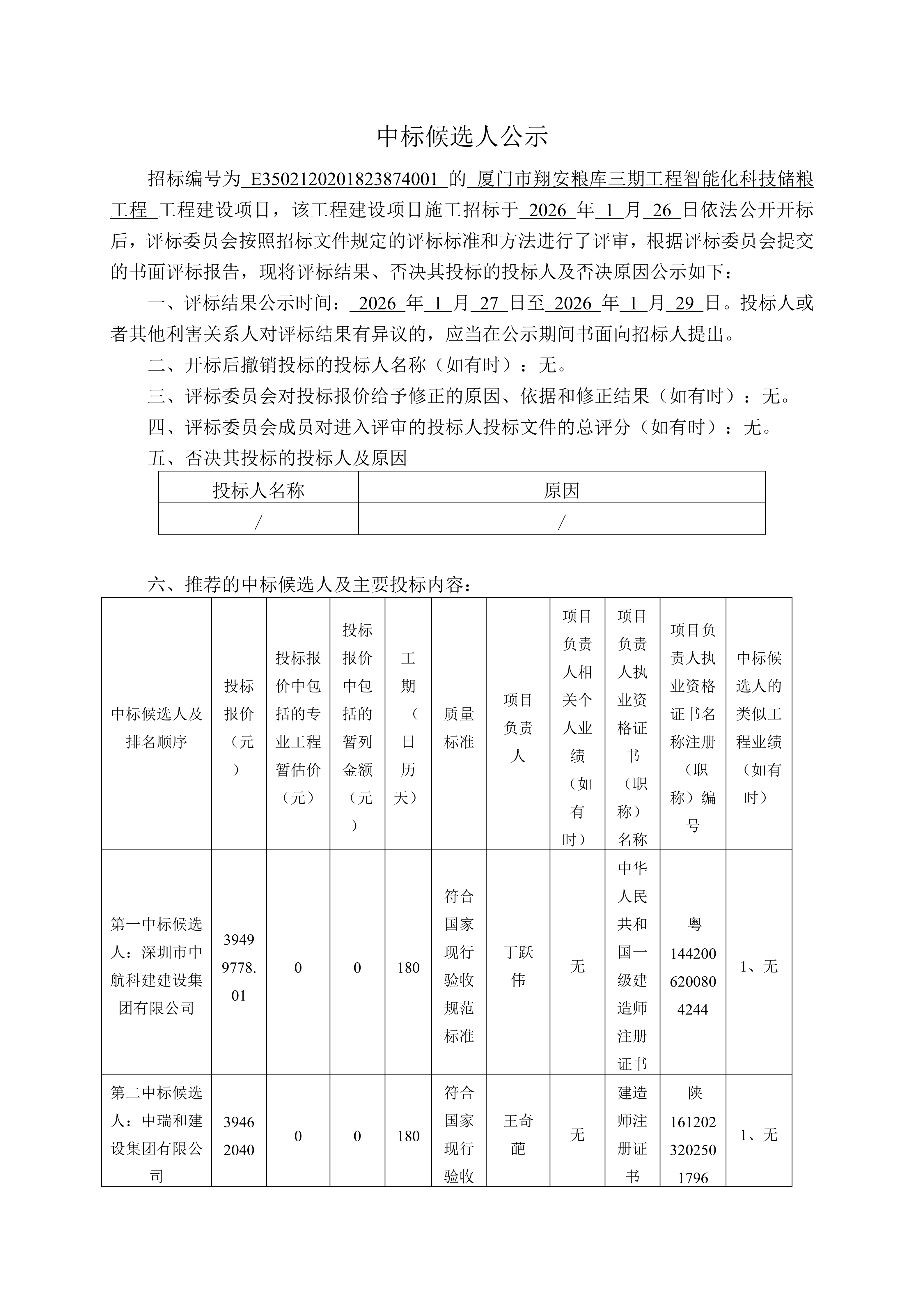 厦门市翔安粮库三期工程智能化科技储粮工程项目中标候选人公示